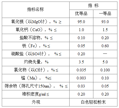 2、物化性質:白色無定型粉末。無臭、無味、無毒。相對密度約為3.58(25℃)。熔點2852℃,沸點3600℃。難溶于水,不溶于醇,溶于酸或銨鹽溶液中。經1000℃以是高溫灼燒,可轉化為晶體。溫度升高到1500℃以上時,則成輕燒氧化鎂或燒結氧化鎂。吸收空氣中的二氧化碳生成堿式碳酸鎂。