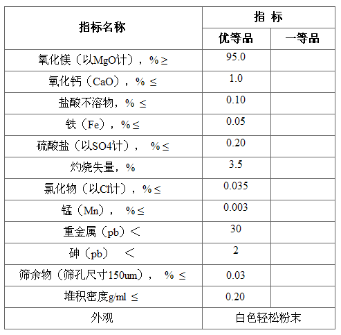 2、物化性質(zhì):白色無定型粉末。無臭、無味、無毒。相對密度約為3.58(25℃)。熔點2852℃,沸點3600℃。難溶于水,不溶于醇,溶于酸或銨鹽溶液中。經(jīng)1000℃以是高溫灼燒,可轉(zhuǎn)化為晶體。溫度升高到1500℃以上時,則成輕燒氧化鎂或燒結(jié)氧化鎂。吸收空氣中的二氧化碳生成堿式碳酸鎂。